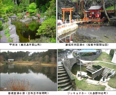 また,昭和の名水百選に選定された清水の湧水(南九州市)や霧島山麓丸池湧水(湧水町),屋久島宮之浦岳流水(屋久島町),平成の名水百選に選定された甲突池(鹿児島市)や,唐船峡京田湧水(指宿市),普現堂湧水源(志布志市),ジッキョヌホー(知名町)をはじめ,各地に湧水や流水があり,地域の人々に親しまれています。