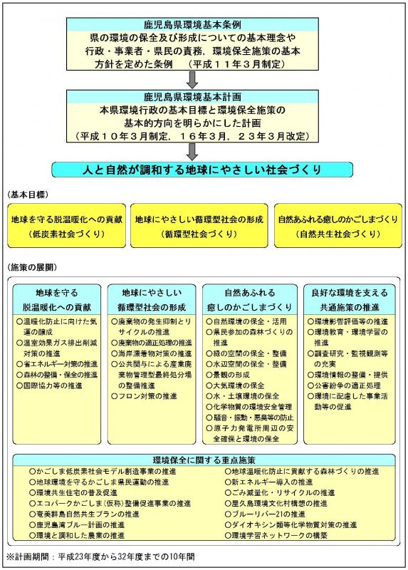 このため,県民,事業者,行政それぞれの責務を明らかにするとともに,公害の防止,自然環境の保全,地球環境の保全などに関する各種施策を推進するに当たっての基本理念や基本方針を定めた「環境基本条例」を制定するとともに,本条例に基づき,本県環境行政の基本目標と環境保全施策の基本的方向を明らかにした「鹿児島県環境基本計画」を策定し「人と自然が共生する環境にやさしい社会の実現」に向け,各種の施策相互の連携を図りながら,総合的に施策を展開しています。