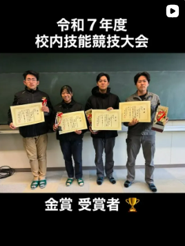 先般開催された校内技能競技大会の表彰式が、第三過程終業式に合わせて執り行われました。県職業能力開発協会から表彰された上位入賞者に、福迫校長から賞状やトロフィーカップが手渡されました。審査結果は以下のとおりです。入賞した皆さん、おめでとうございます!
