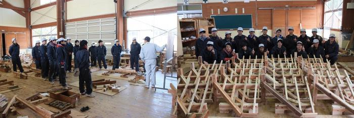 11月某日、毎年恒例の校内技能競技大会が開催されました。建築工学科1年生は「継ぎ手・仕口工作」、2年生は「登りばり架け」の課題を製作しました。かんなでの木削り、墨付け、加工、組立ての順に作業を行い、制限時間内の出来映えや精度で競います。技能向上意欲を一層高めるため、成績優秀者は県職業能力開発協会長から表彰されます。