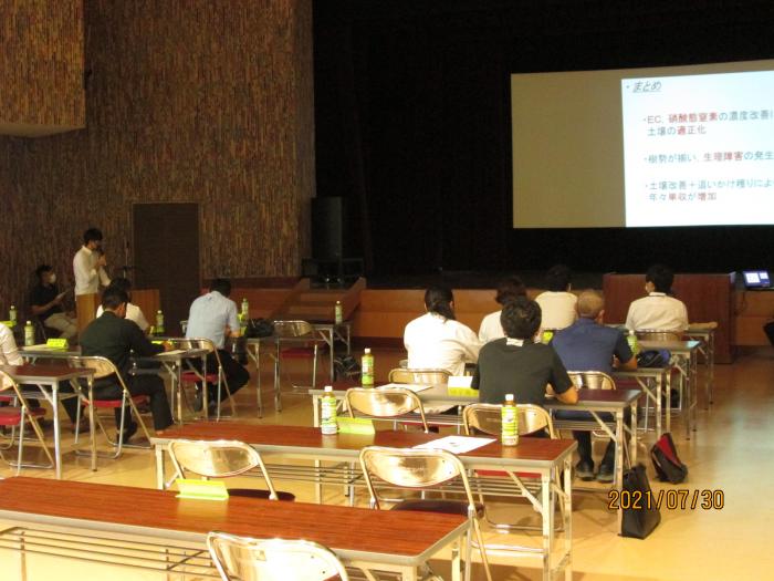 7月28日から29日にかけて,長島地区の27か所で令和4年産早春作ばれいしょ栽培講習会が開催された。会では単収向上等に向け,栽培基準表の改訂点や注意すべき管理作業等を説明した。また,土壌診断結果をもとに農政普及課が作成した処方箋を活用し,個別面談で施肥改善等を指導した。土壌診断数が昨年度の95点から124点に増加し,施肥改善への意識向上が図れてきた。今後も,関係機関・団体と連携し,単収向上等を図る計画である。