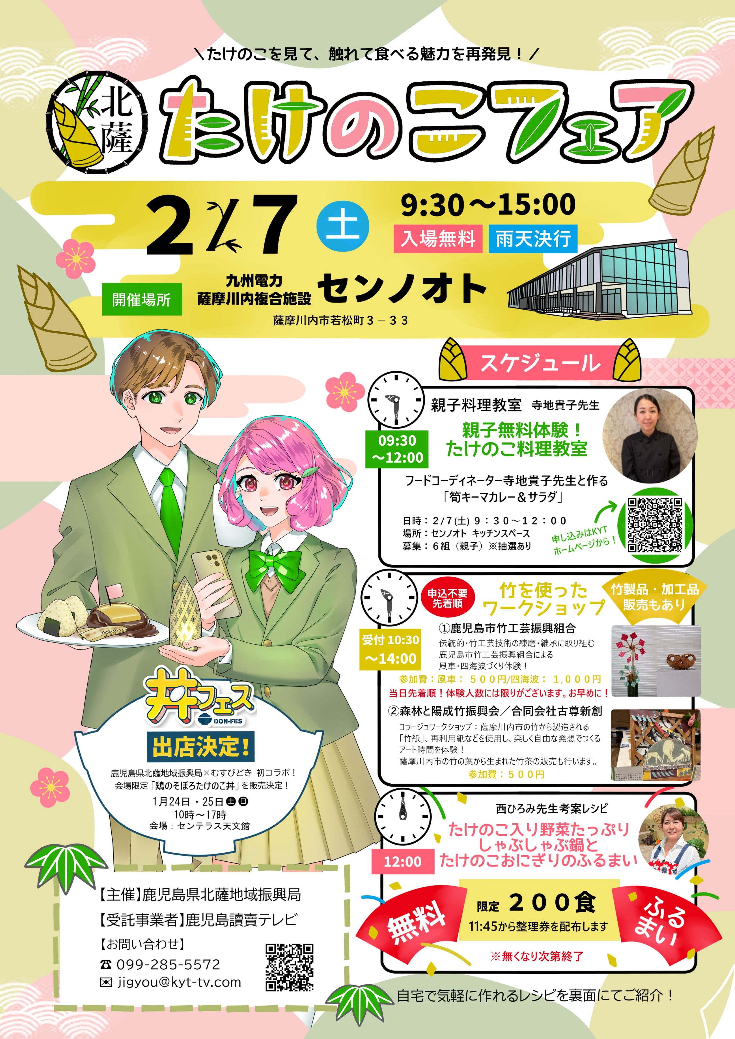 「丼フェス」,「たけのこフェア」の来場者でアンケートに答えていただいた方に,抽選でタケノコ製品やペア宿泊券をプレゼント