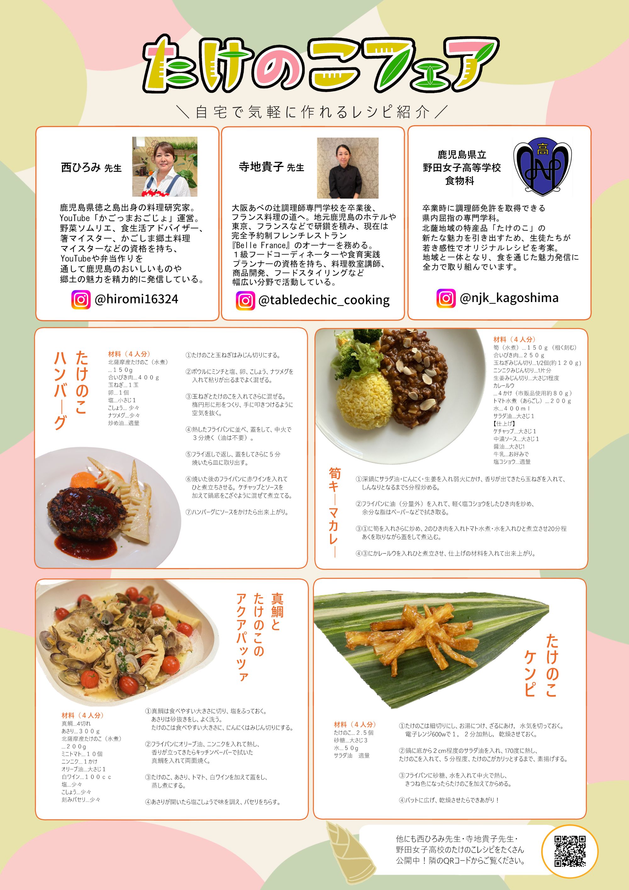 〇県内の料理家2名(西ひろみ氏,寺地貴子氏)と野田女子高校食物科1年生15人の学生,おにぎり専門店むすびどきさんの協力で19品のたけのこ料理のレシピができました。