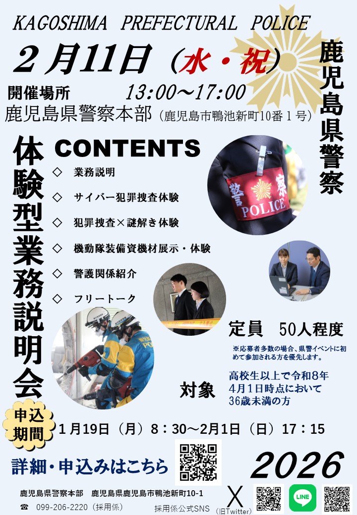 2月11日に鹿児島県警察本部で開催する体験型業務説明会の内容について掲載しています。
