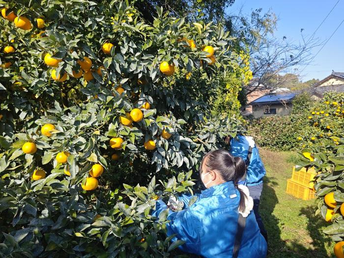 12月18,19日に,鶴翔高校農業科学科の1,2年生及び食品技術科1年生,計51人が,阿久根市桐野地区を中心に,甘夏の収穫作業を行う地域貢献活動を実施しました。農政普及課は,12月15日に甘夏の収穫方法や生産概要,栽培管理,出荷までの流れ等について事前講習を行いました。甘夏は収穫時期の労力確保が課題となっており,この収穫実習に期待する生産者も多い状況です。生産者からの評判はおおむね良好であり,冬季のアルバイトに勧誘したいとの声も多く聞かれました。労力確保の取組について,引き続き支援します。